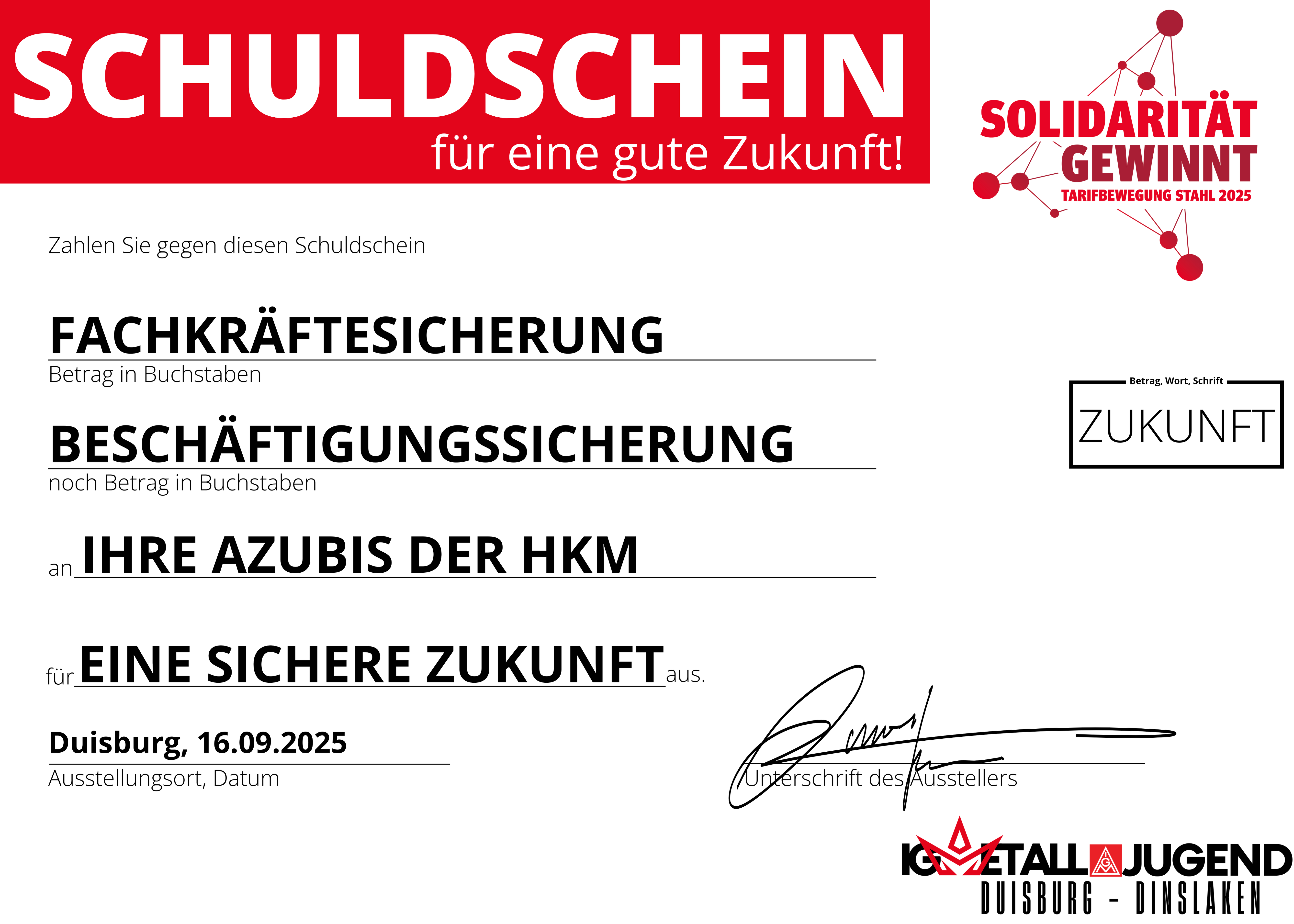 Bei den Hüttenwerken Krupp Mannesmann schließlich flatterte dem Arbeitsdirektor ein Schuldschein ins Haus. Ein deutlicher Hinweis darauf, dass die Beschäftigten in der Vergangenheit schon viel gegeben haben. Jetzt ist die Gegenseite dran. „Die Kolleginnen und Kollegen haben oft verzichtet. Jetzt stehen die Arbeitgeber in der Schuld, endlich zu liefern“ forderte Mustafa Arabaci, JAV-Vorsitzender bei HKM.