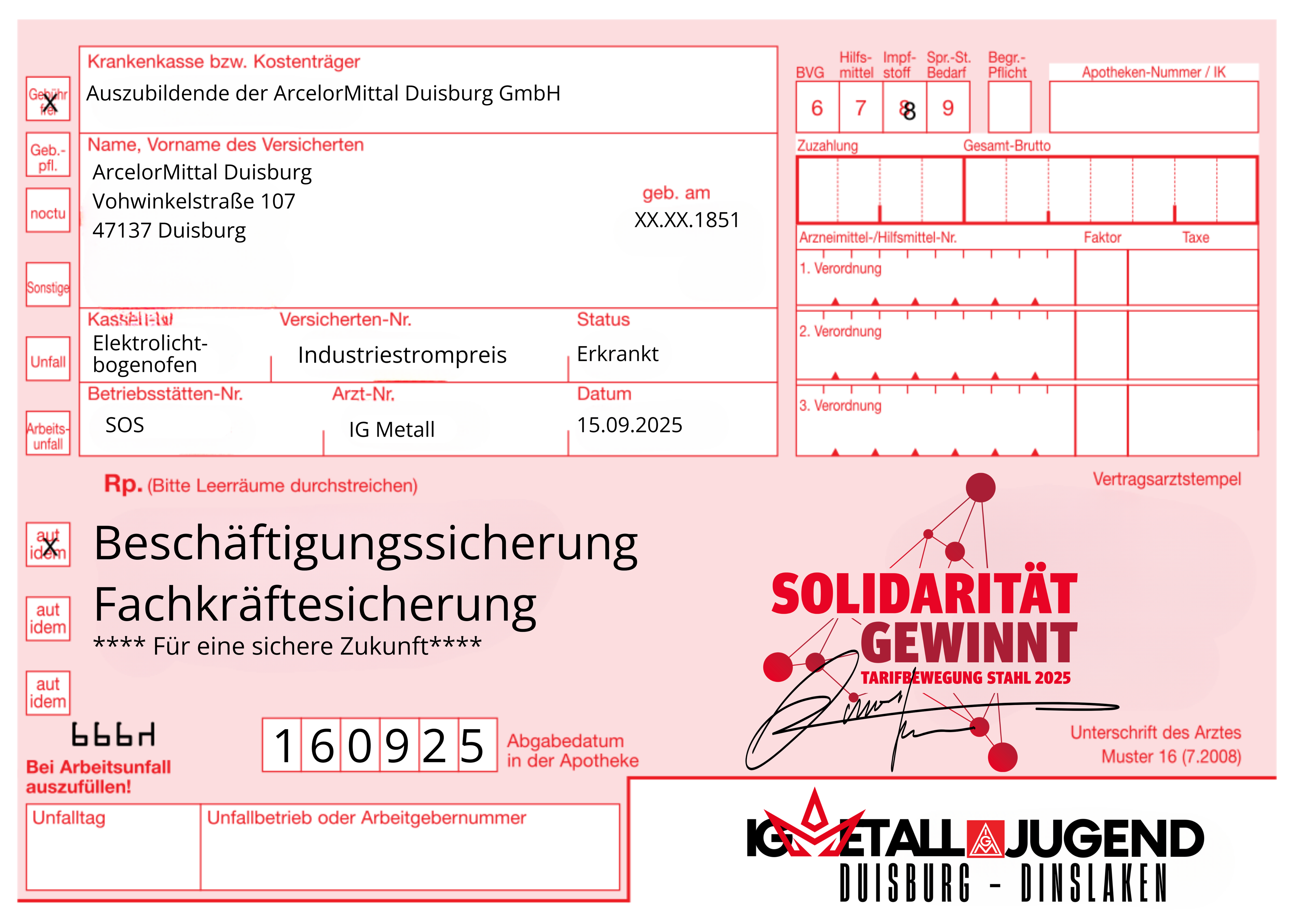 Bei ArcelorMittal hielten die Azubis dem Geschäftsführer Rajesh Puvvada ein Medikamentenrezept entgegen. Für sie ist klar: Ohne die richtigen Wirkstoffe – gute Bezahlung, sichere Jobs und Perspektiven – ist der Standort nicht gesund zu halten. „Unsere Forderungen sind wie ein Rezept für gesunde Arbeits- und Ausbildungsbedingungen. Ohne die richtige Mischung fehlt die Medizin, die den Standort fit hält“ sagte Melih Eroglu, Stellvertretender JAV-Vorsitzender bei ArcelorMittal.