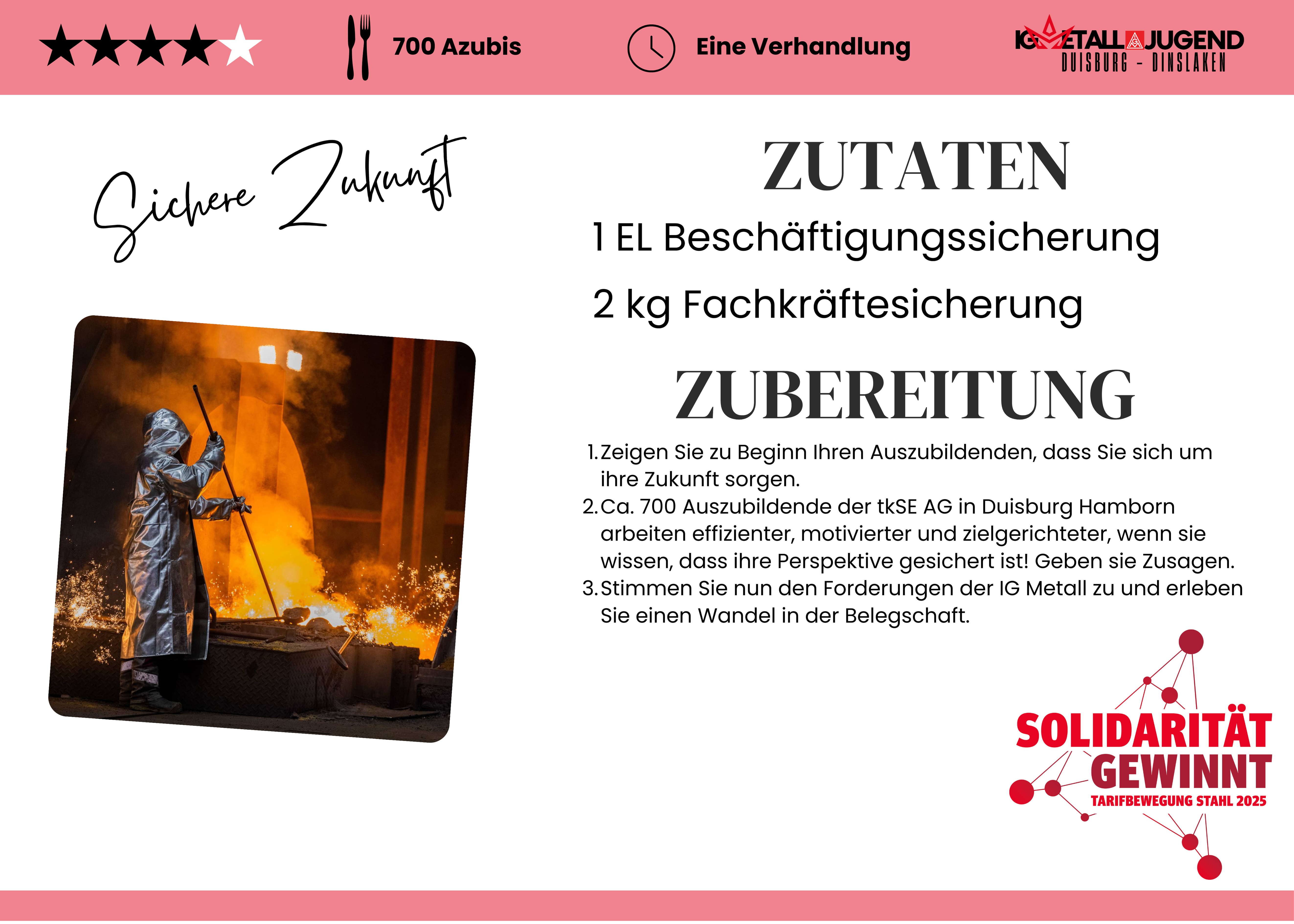 Die Kolleginnen und Kollegen von thyssenkrupp Steel Europe servierten ihre Botschaft in Form eines Kochrezepts. Was dabei herauskommt, wenn die Arbeitgeber die falschen Zutaten nehmen, wissen sie nur zu gut. „Wer gute Fachkräfte will, muss die richtigen Zutaten liefern – faire Löhne, Ausbildungsqualität und Perspektiven. Sonst bleibt am Ende ein fader Brei“ brachte es Muhammad Ali Saado, JAV-Vorsitzender bei tkse, auf den Punkt. Weiterhin sagte er: "Man kann zuhause gut kochen, man kann Stahl kochen - aber noch viel wichtiger und lecker für uns - man kann auch gute Tarifverträge kochen".