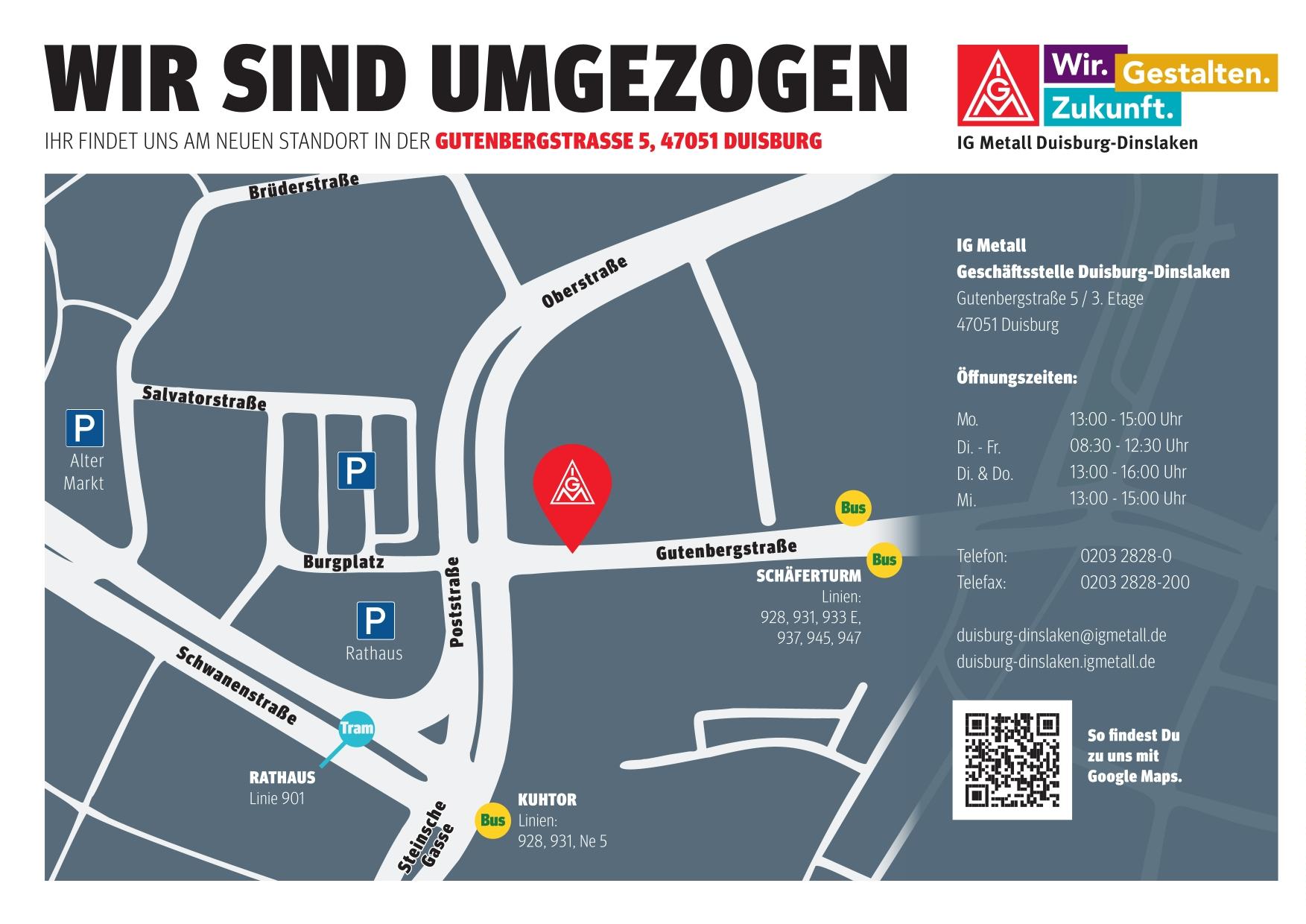 Die IG Metall Duisburg-Dinslaken ist umgezogen: Ihr findet uns nun auf der Gutenbergstraße 5