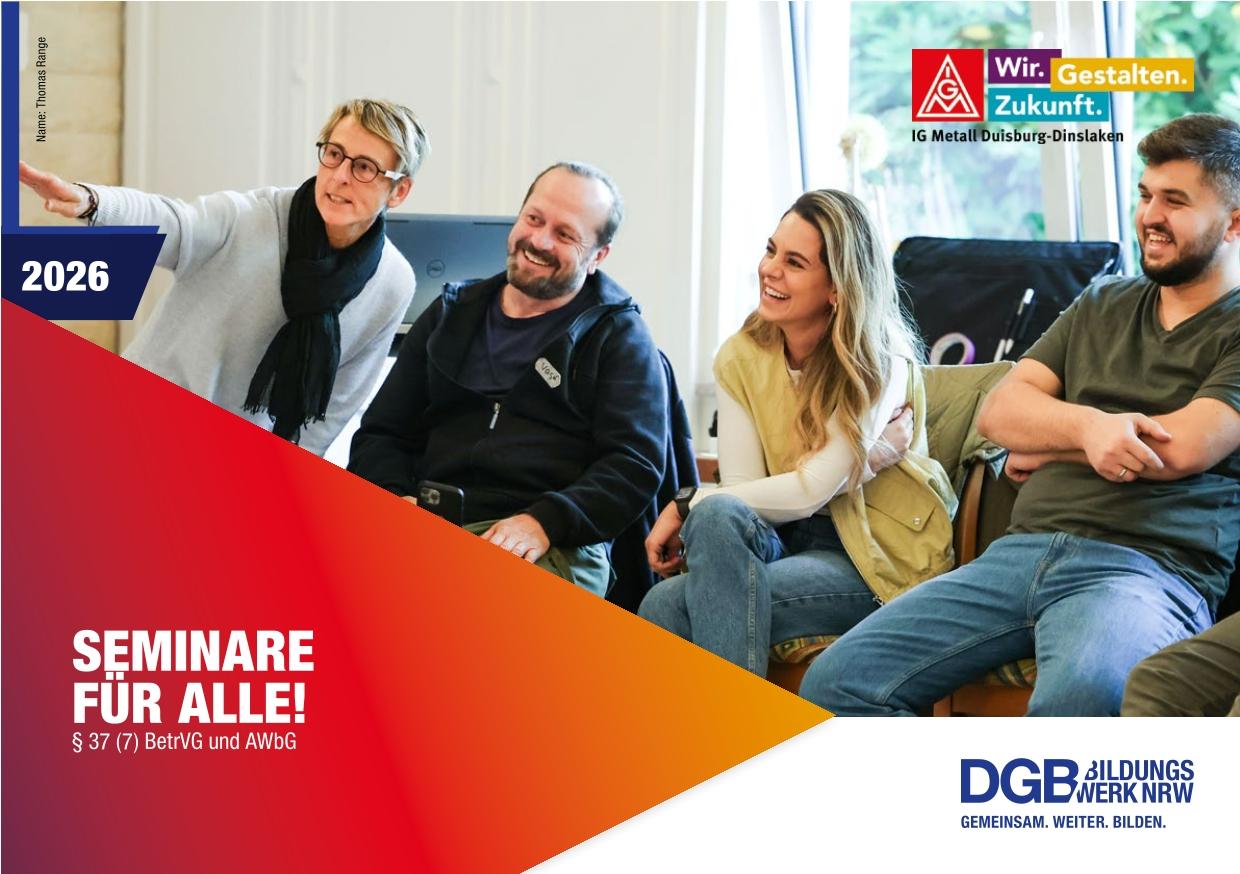 Wir sind sicher, dass Du in den von der IG Metall angeboten Seminaren für Dich und Deine Kolleginnen und Kollegen das passende Seminar findest. Freue Dich auf eine gelungene, entspannte Bildungszeit und auf interessante Begegnungen. Wir freuen uns darauf, dich demnächst in einem unserer Seminare begrüßen zu dürfen.